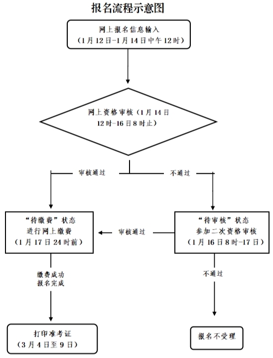 (2)1月16日8:00前,报考人员须登录报名网站查询审核状态,只有报名状态为“待缴费”的考生,表示网上资格审核通过,可按要求进行网上缴费确认;仍显示为“待审核”状态的则表明资格审核未通过。
