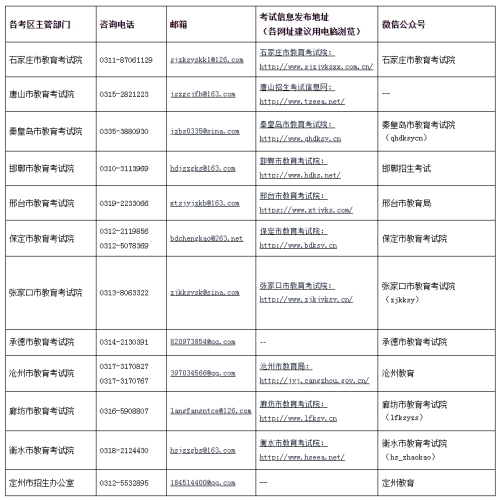 八、各考区主管部门、咨询电话(工作日9:00-11:00,14:30-17:00)、邮箱、网址及微信公众号