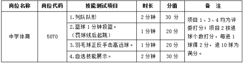 1、参加考核的人员为笔试后入围考核的人员。2、考生应于2024年1月18日(星期四)14∶30到学校高中部实验楼一楼中学会议厅集合,否则视为自行放弃。3、考生须凭本人有效居民身份证原件、在有效期内的临时身份证或有本人照片的户籍证明(不可用电子身份证、驾照、护照或乘车乘机临时身份证明等替代)参加考核,否则不能参加考核。考核时考生不得自带任何资料。4、考核办法①考核顺序由考生抽签确定。②中学体育岗位的考核由面试、试教、技能测试组成;其他岗位的考核由面试、试教组成;面试、试教、技能测试满分均为100分。面试、试教时长共12分钟,准备时长共40分钟。中学体育岗位的技能测试办法见下表:
