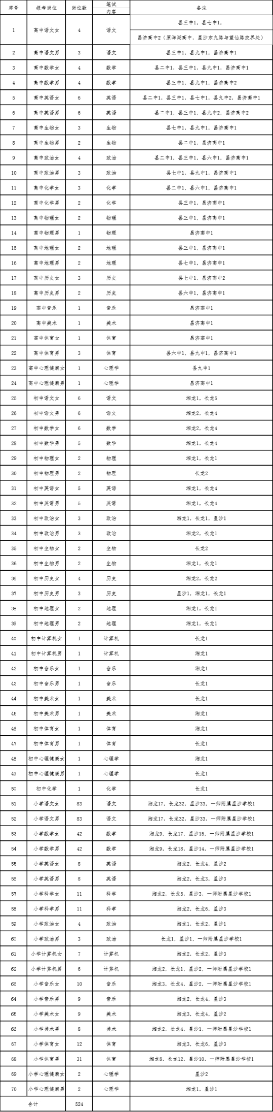 为了促进我县教育事业快速发展,经县人事编制领导小组同意,2020年长沙县教师招聘分两批次进行,第一批次招聘中小学教师524名,第二批次招聘中小学教师和幼儿教师共计372名(公告随后发布)。现将第一批次招聘有关事项公告如下: