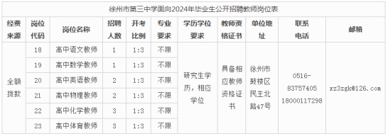 《徐州市第三中学面向2024年毕业生公开招聘教师公告》在徐州市人力资源和社会保障局网站(http://hrss.xz.gov.cn)、徐州市教育局网站(http://jyj.xz.gov.cn)、徐州市第三中学网站(http://www.xz3z.com)发布,具体的岗位名称、招聘人数、资格条件等详见下表。