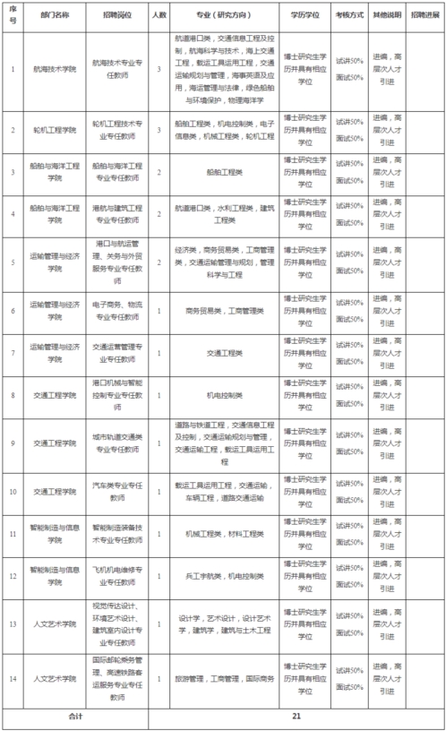 招聘具有博士研究生学历的专任教师21名,使用事业单位人员编制,具体岗位和条件见江苏航运职业技术学院招聘岗位及要求表(附表)。
