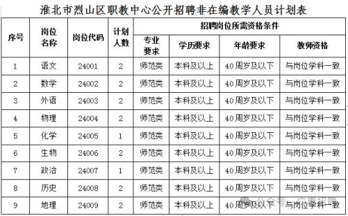 招聘教学人员16名。具体岗位详见附件《淮北市烈山区职教中心公开招聘非在编教学人员计划表》。