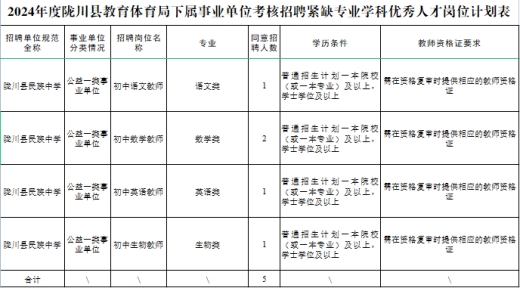 根据《关于同意县教育体育局党组使用编制通知单》(陇机编办准[2023]4号)、《陇川县人力资源和社会保障局关于印发2024年教育卫生部门考核招聘紧缺专业学科优秀人才工作方案的通知》陇人社发〔2024〕2号文件,同意陇川县民族中学招聘教师5人,招聘岗位属正式在职在编专业技术人员。为认真做好2024年考核选优工作,现将相关事宜公告如下: