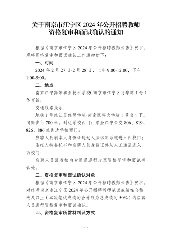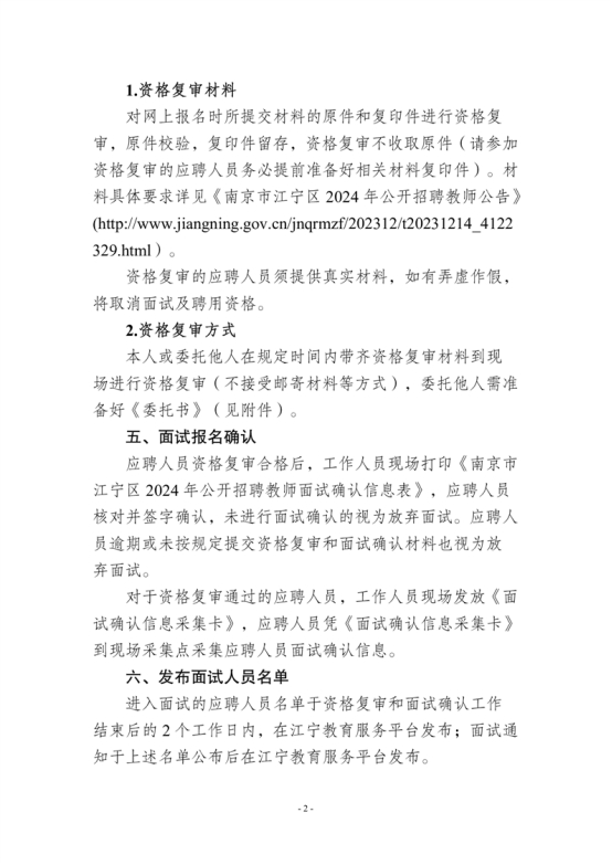 2024年江苏省南京市江宁区教师招聘资格复审和面试确认的通知