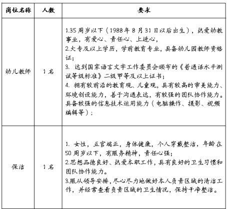 四、招聘岗位和条件幼儿教师1名;保洁1名。