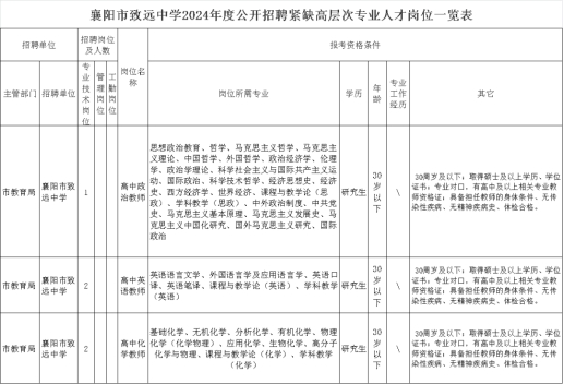 根据《事业单位公开招聘人员暂行规定》(原人事部令第6号)、湖北省人力资源和社会保障厅《关于进一步规范全省事业单位公开招聘工作的若干意见》(鄂人社发〔2016〕23号)文件精神,襄阳市致远中学现面向社会公开招聘紧缺高层次人才5名。