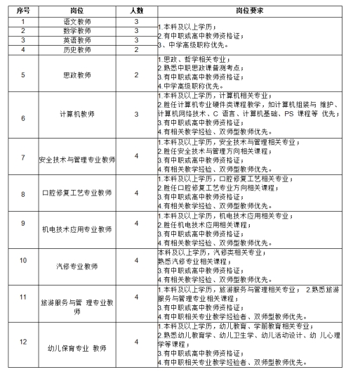 现因学校办学规模扩大和新增专业,特诚聘以下岗位人员: