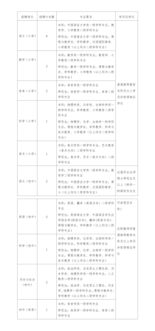 5.应届毕业生须符合招聘岗位所需学历学位及对应的专业等要求;在职教师要求所持教师资格证书或大学所学专业须同报考岗位对口。学历学位证书、资格证书、荣誉证书等材料须在报名前取得,其中应届毕业生的学历学位证书须于2024年8月31日前取得(留学人员须在2024年10月31日前取得教育部留学服务中心出具的国外境外学历学位认证书)。