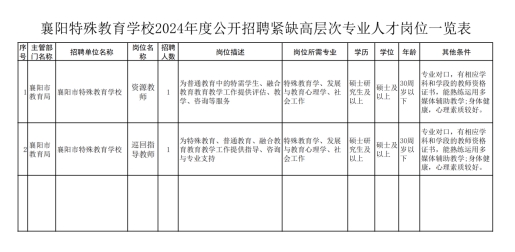 为推动全市特殊教育、融合教育改革发展,落实2024年《市教育局工作要点》推进市级特殊教育资源中心建设的任务,襄阳市特殊教育学校拟公开招聘紧缺高层次专业人才2名。岗位条件详情见《襄阳市特殊教育学校2024年度公开招聘紧缺高层次专业人才岗位表》。