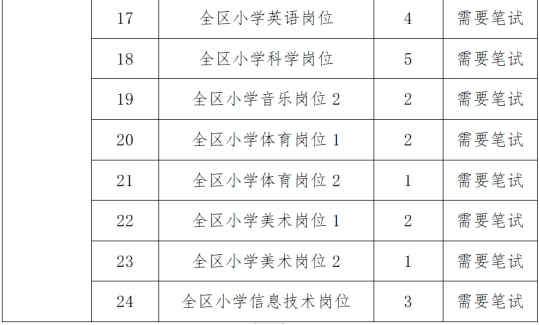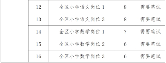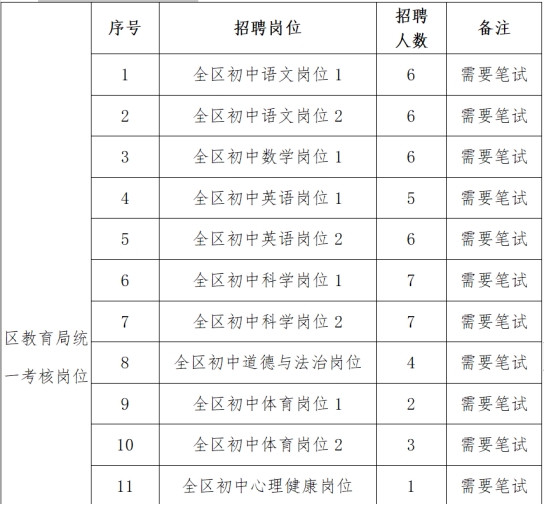 区教育局统一考核岗位中,招聘岗位数与进入面试人数比例:招聘人数1-2人的为1:8,招聘3-5人的为1:5,招聘6-7人的为1:4,招聘8人及以上的为1:3。超过上述比例的,面试前进行笔试,并根据上述比例按笔试成绩高低确定面试对象。
