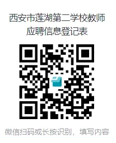 应聘人员扫描二维码在线填写《教师应聘信息登记表》,并将个人简历发送至邮箱xaslhdexx@126.com或送至西安市莲湖第二学校传达室。报名日期:即日起至2024年5月5日。