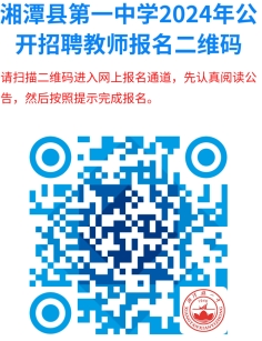 在报名时间内应聘人员扫描上方“湘潭县第一中学2024年公开招聘教师报名二维码”,下载并填报《湘潭县第一中学2024年公开招聘教师报名登记表》(详见附件3,以下简称“《报名登记表》”),上传资料完成报名。