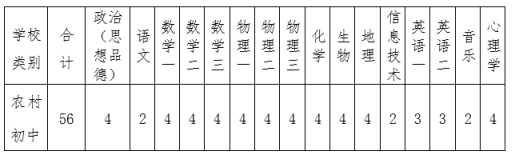共招聘特岗教师74名,其中:初中56名,小学18名。具体岗位招聘计划详见岗位数量表一、表二: