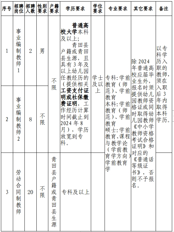 附件:2024年青田县公开招聘幼儿园教师岗位计划表