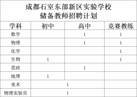 锦绣石室,赓扬向东!为传承石室精神,促进成都市东部新区教育发展的重任,成都石室中学与东部新区联合打造成都石室东部新区实验学校,为成渝双城经济圈建设贡献教育力量。学校现面向全国招聘优秀应届生、在职教师!我校每月将按照2025级教师缺口数量开展招聘活动,敬请期待。