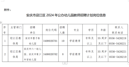2024年迎江区计划公开招聘公办幼儿园教师18名,均为全额拨款事业编制。(岗位计划信息见附件)