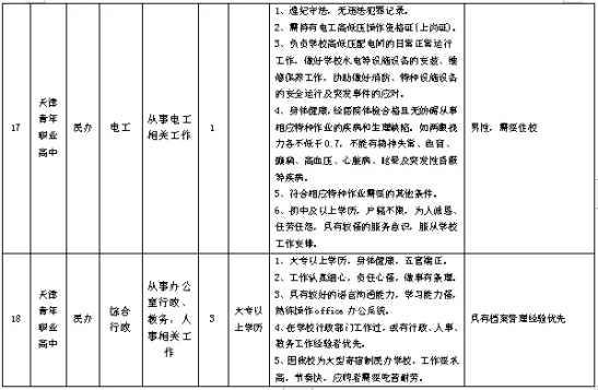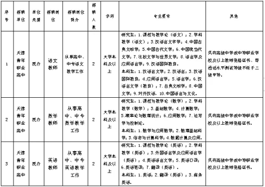天津青年职业高中(Tianjin Youth Vocational High School)经天津市教育主管部门正式批复,兼具普通教育与职业教育特色、全封闭寄宿制准军事化管理的综合高级中学。学校遵循“明德笃学,自强不息”的校风校训,秉持“德育为先,以技立身”的办学宗旨,坚持“普职并举,以职促普”的办学理念。为优化教师队伍结构,充实优秀师资力量,经研究,决定面向社会公开招聘教师33名,具体内容如下: