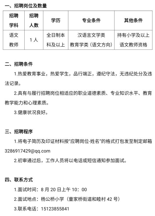 重庆市沙坪坝区杨公桥小学2024年公开招聘非编教师公告