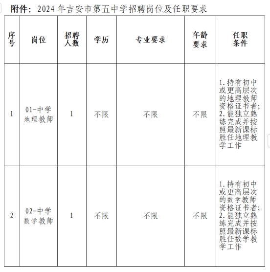 详见附件《吉安市第五中学公开招聘岗位及任职要求》。