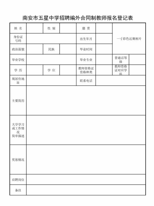 (3)报名应交材料:①学历学位证书或证明复印件②中学教师资格证书或证明复印件③身份证复印件④填写《五星中学招聘编外合同制教师报名登记表》请在9月11日17:30前,将四项“应交材料”电子稿压缩打包发送至chendonglin1979@126.com。纸质稿待面试时缴交。