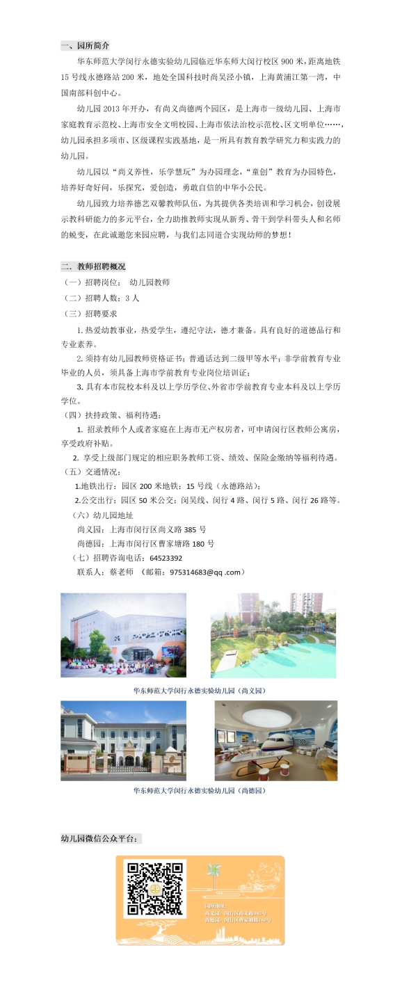 华东师范大学闵行永德实验幼儿园2024年秋季教师招聘公告