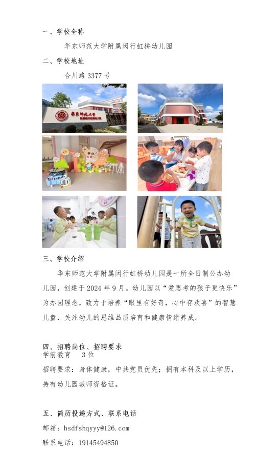 华东师范大学附属闵行虹桥幼儿园2024年秋季教师招聘公告