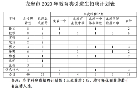(一)市属中学教育引进类:招聘语文、数学、英语、物理、化学、生物、政治、历史、地理、信息技术等学科18名教师。根据《福建省龙岩市2020年教育类引进生招聘公告》精神,“2020年龙岩市属学校计划引进优秀高校毕业生40名,在引进优秀高校毕业生数量达不到40名时,允许进行学科调剂,调剂的顺序为信息技术、语文、数学、英语、物理、化学、生物、历史、地理、政治”。