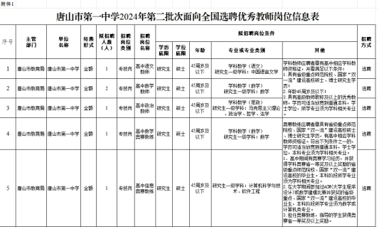 附件:唐山市第一中学2024年第二批次面向全国选聘优秀学科教师和优秀竞赛教练岗位信息表
