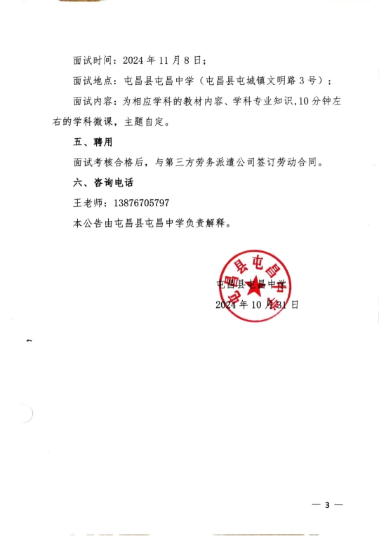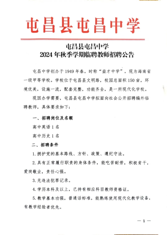 海南省屯昌县屯昌中学2024年秋季学期临聘教师招聘公告