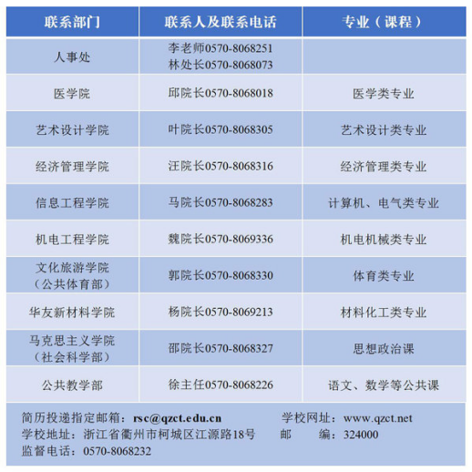 本次高层次紧缺人才引进信息通过衢州市人力资源和社会保障局网站、衢州职业技术学院网站公开发布。具体引进工作由衢州职业技术学院组织实施,按应聘报名、资格审查、面试、体检考核、公示聘用等程序进行。