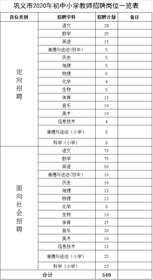根据工作需要,经市政府批准,我市2020年计划招聘初中、小学教师540名。为贯彻落实国家、省关于应对疫情影响,做好高校毕业生就业工作的相关政策规定,真正使有志于从事教育事业的优秀高校毕业生脱颖而出,结合我市实际,经研究,对我市2019年11月发布的《巩义市2020年招聘初中小学教师公告》进行调整,现将调整后的公告公布如下(以本次发布的公告为准):
