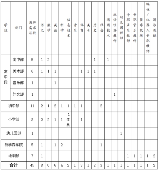因学校发展需要,拟公开招聘45名各学段学科教师。具体岗位招聘计划如下: