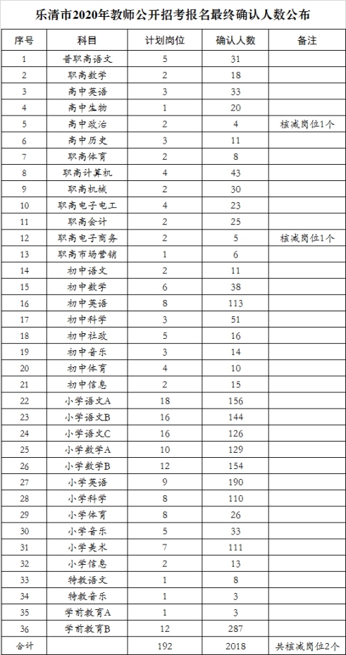 2020年浙江省温州乐清市教师招考报名最终确认人数公布(含岗位核减)