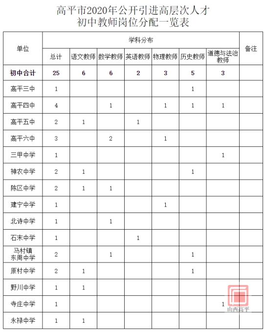 附件2:《高平市2020年公开引进高层次人才初中教师岗位分配一览表》