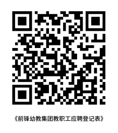 线上报名:应聘者请下载《前锋幼教集团教职工应聘登记表》并填写,各类相关证书(含身份证、学历学位证、教师资格证、毕业生就业协议、毕业生就业推荐表、职称证书、各级各类获奖证书等)扫描(照片)电子档附在应聘登记表后的WORD文档中。将文档以“姓名+应聘材料”命名,以附件形式发送到幼儿园邮箱399219385@qq.com,发送的文件不得大于5M。登记表内填写情况必须真实有效,否则取消应聘资格。经初审合格者电话通知考核。(应聘材料恕不一一答复)