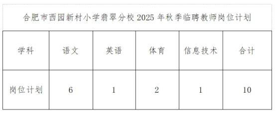 附件:合肥市西园新村小学翡翠分校代课教师招聘岗位计划表及相关要求
