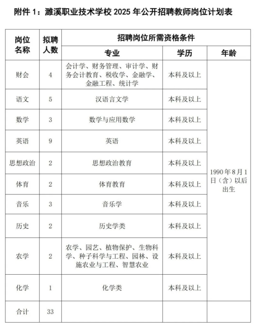 公开招聘教师33名,具体招聘岗位、学历、人数、专业等条件详见《濉溪职业技术学校2025年公开招聘代课教师岗位计划表》(附件1)