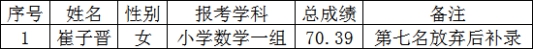 根据《2020年南京市秦淮区教育局所属学校公开招聘新教师公告》(宁事招公告核〔2019〕70号)精神,根据总成绩排名,拟补充崔子晋入围体检,现予以公示。如有异议,请于公示期间提出。
