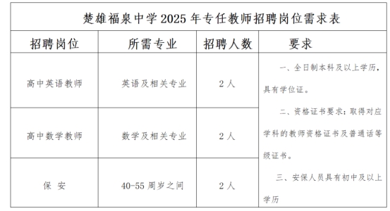 楚雄福泉中学2025年公开招聘部分学科专任教师及安保人员公告(二)