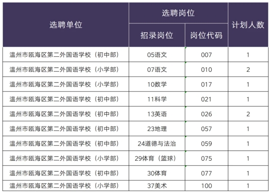 根据《温州市瓯海区教育系统2025年面向高校公开选聘优秀毕业生公告》(温瓯教发〔2025〕204号)精神,温州市瓯海区第二外国语学校招聘12名优秀高校毕业生。