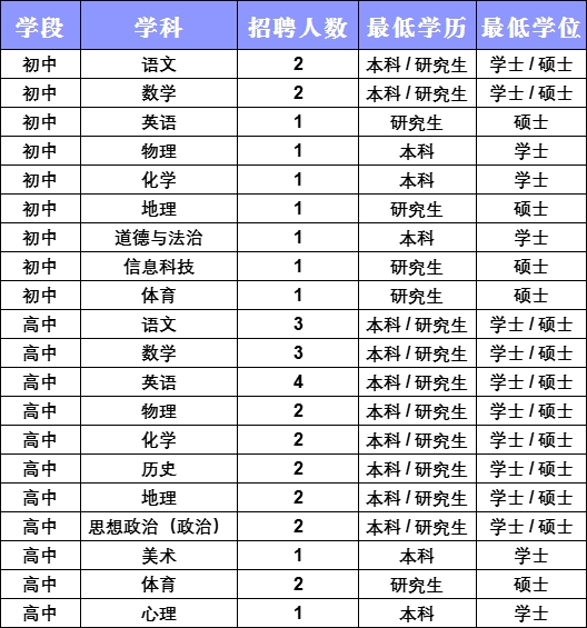 一、招聘岗位及具体要求本次招聘涵盖初中、高中两个学段多个学科,各岗位招聘人数、学历学位要求如下: