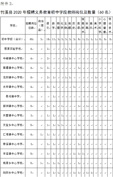 2.竹溪县2020年招聘义务教育初中学段教师岗位及数量(60名)见附件。