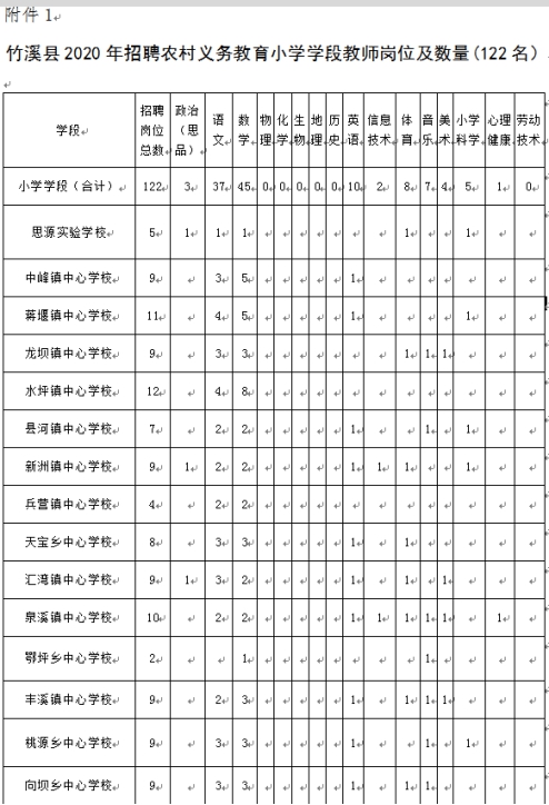 1.竹溪县2020年招聘义务教育小学学段教师岗位及数量(122名)见附件。