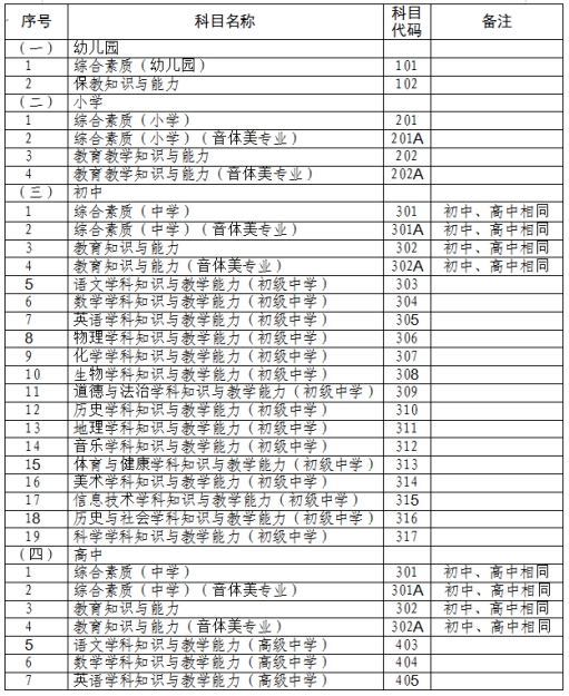 中小学教师资格考试(笔试)科目代码列表