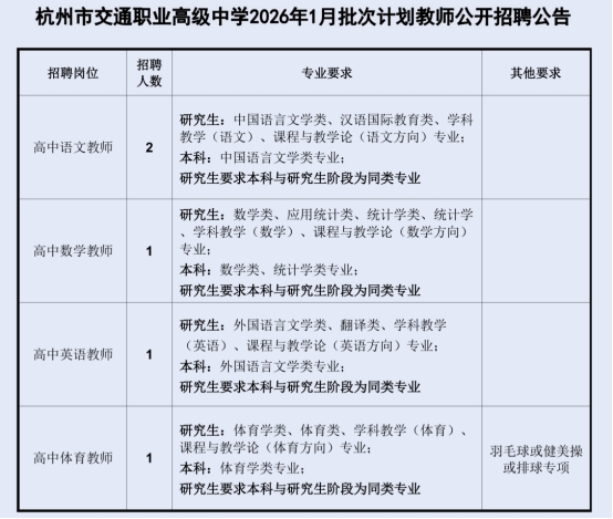 杭州市交通职业高级中学2026年1月批次计划教师公开招聘公告