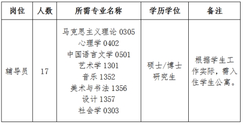 根据学校实际工作需要,经研究决定,2026年公开招聘专职辅导员17名,具体事项公告如下: