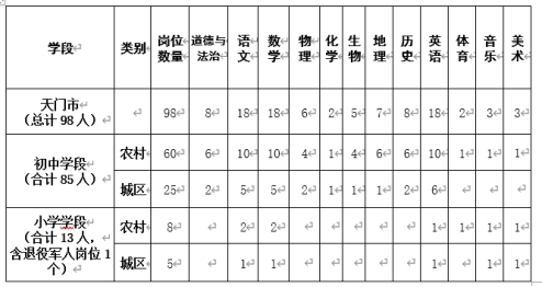 根据中小学编制、岗位空缺情况及教育教学需要,2026年天门市共面向社会公开招聘98名中小学教师,其中初中教师85名(农村初中教师60名、城区初中教师25名),小学教师13名(农村小学教师8名,城区小学教师5名),其中1个农村小学数学教师岗位为面向退役军人招聘岗位,具体岗位如下: