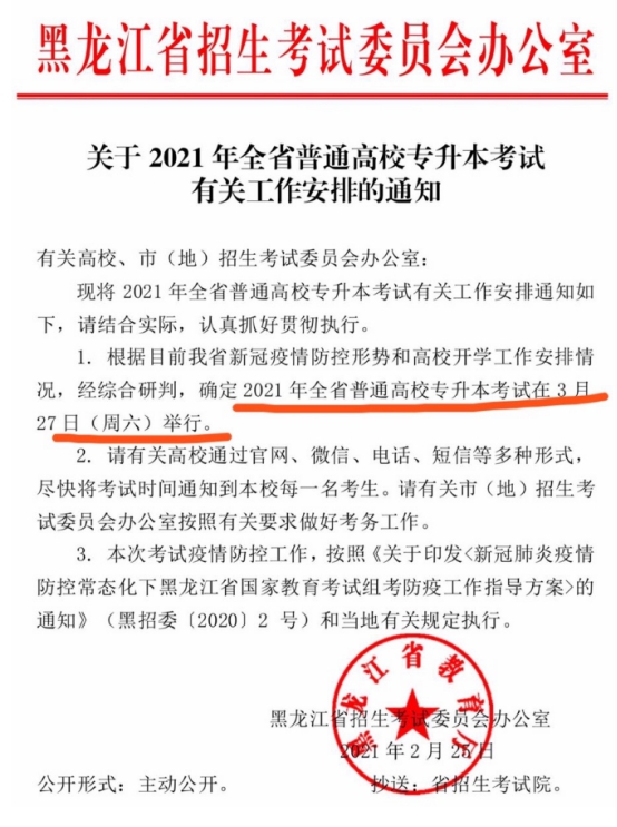 关于推迟2021年黑龙江省专升本考试时间的公告