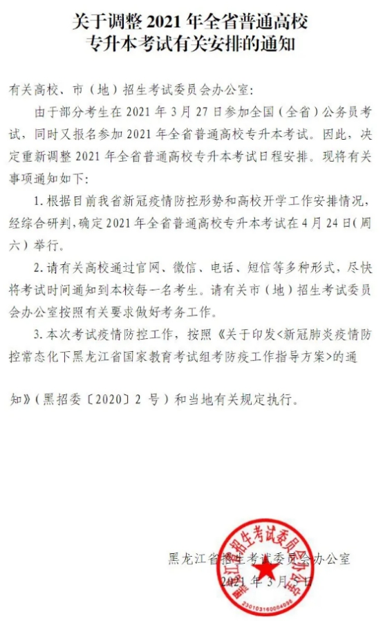 黑龙江专升本原定考试时间3月6日,推迟后考试时间3月27日,今天再次发布通知,考试时间调整为4月24日。